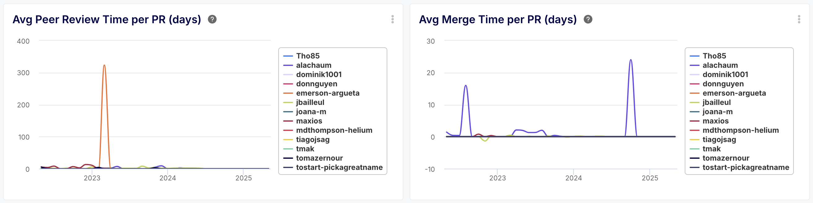 - What you get: Metrics on the average number of peer reviews and comments PRs receive, both team-wide and per developer, including breakdowns by author vs. others.