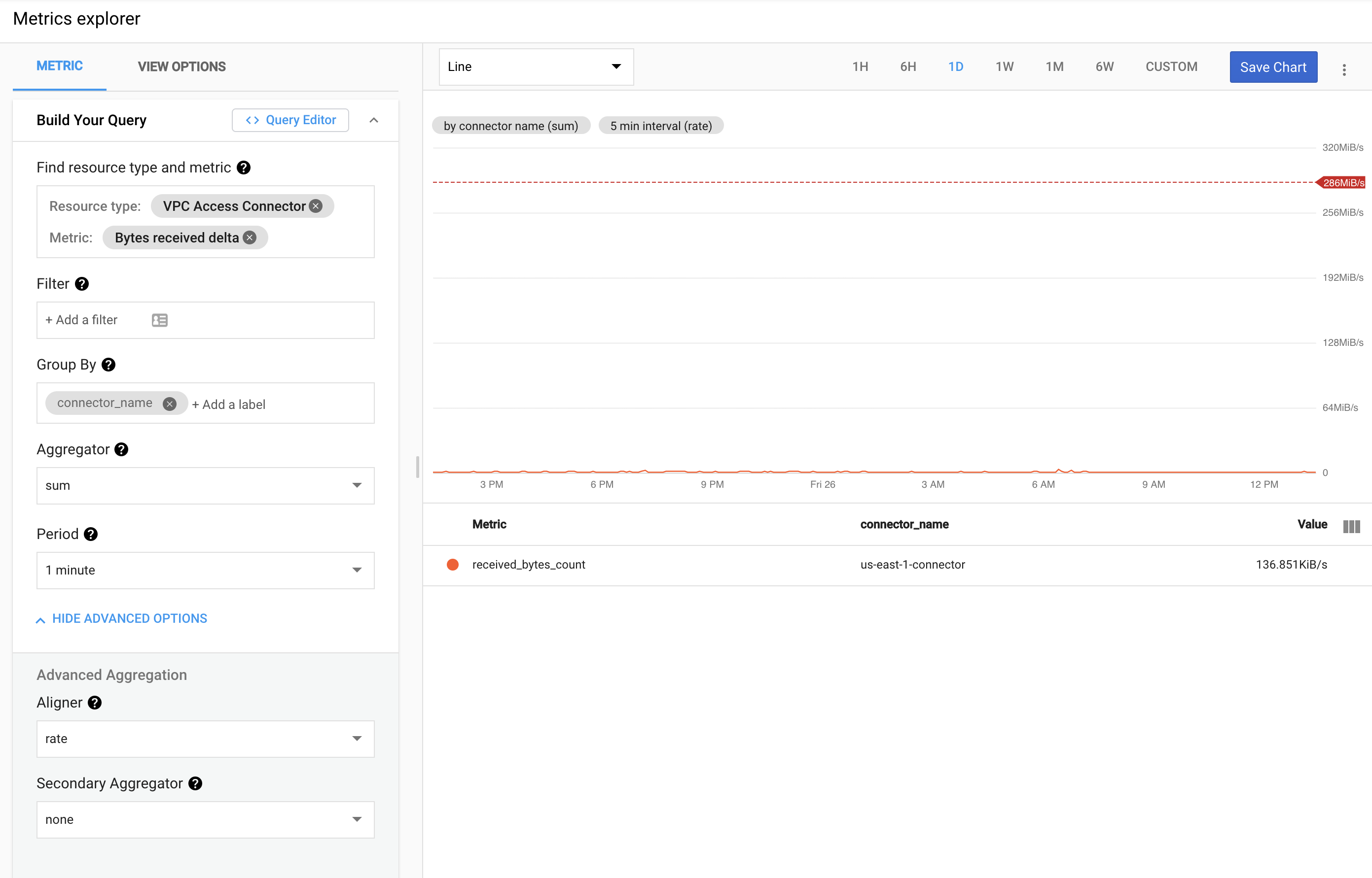 Choose a standard line chart. Then select VPC Access Connector for the resource type and Bytes received delta as the metric. I also recommend you you group by connector_name.