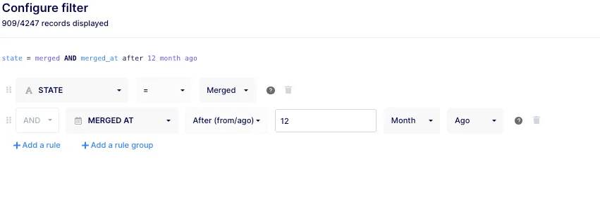 Also, make sure to apply the filter (by clicking on the “Configure filter” button located at the right of the modal) on merged PR only and to select at least a timeframe.Â