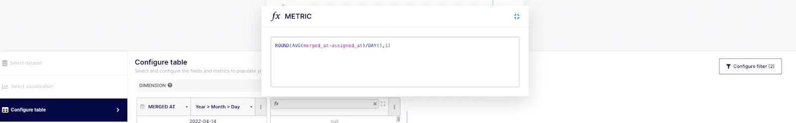 Alternatively, you could use this formula to discard blank fields: ROUND(AVG(merged_at-IF_NULL(assigned_at, created_at))/DAY(),1). To use this specific calculation, you can leverage the PR Lead Time for Changes template and simply replace the “created_at” field with the “assigned_at” field in the “Configure table” section of the advanced builder. You’ll also need to remove the filter on PR only. Note: you won’t be able to estimate the assignment date before your first connection to Keypup so we highly recommend using the previous or following option until you have enough historical data to calculate the assignment date (at least three months).
