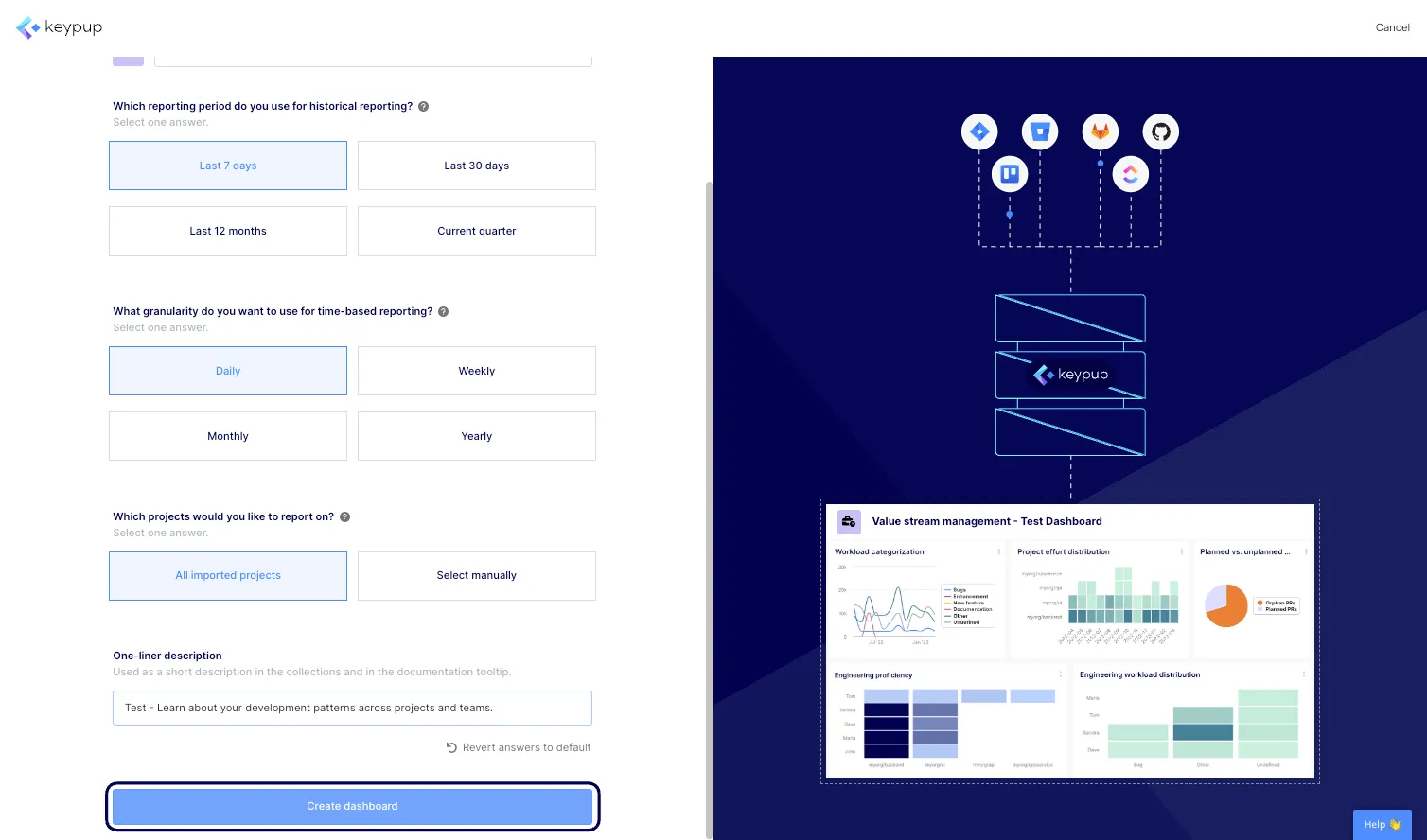 Keypup's configuration assistant empowers users to leverage the power of data analytics without being overwhelmed by complex technicalities. With a user-friendly approach and guided configuration process, teams can quickly adopt Keypup's platform and start harnessing the benefits of software engineering dashboards.