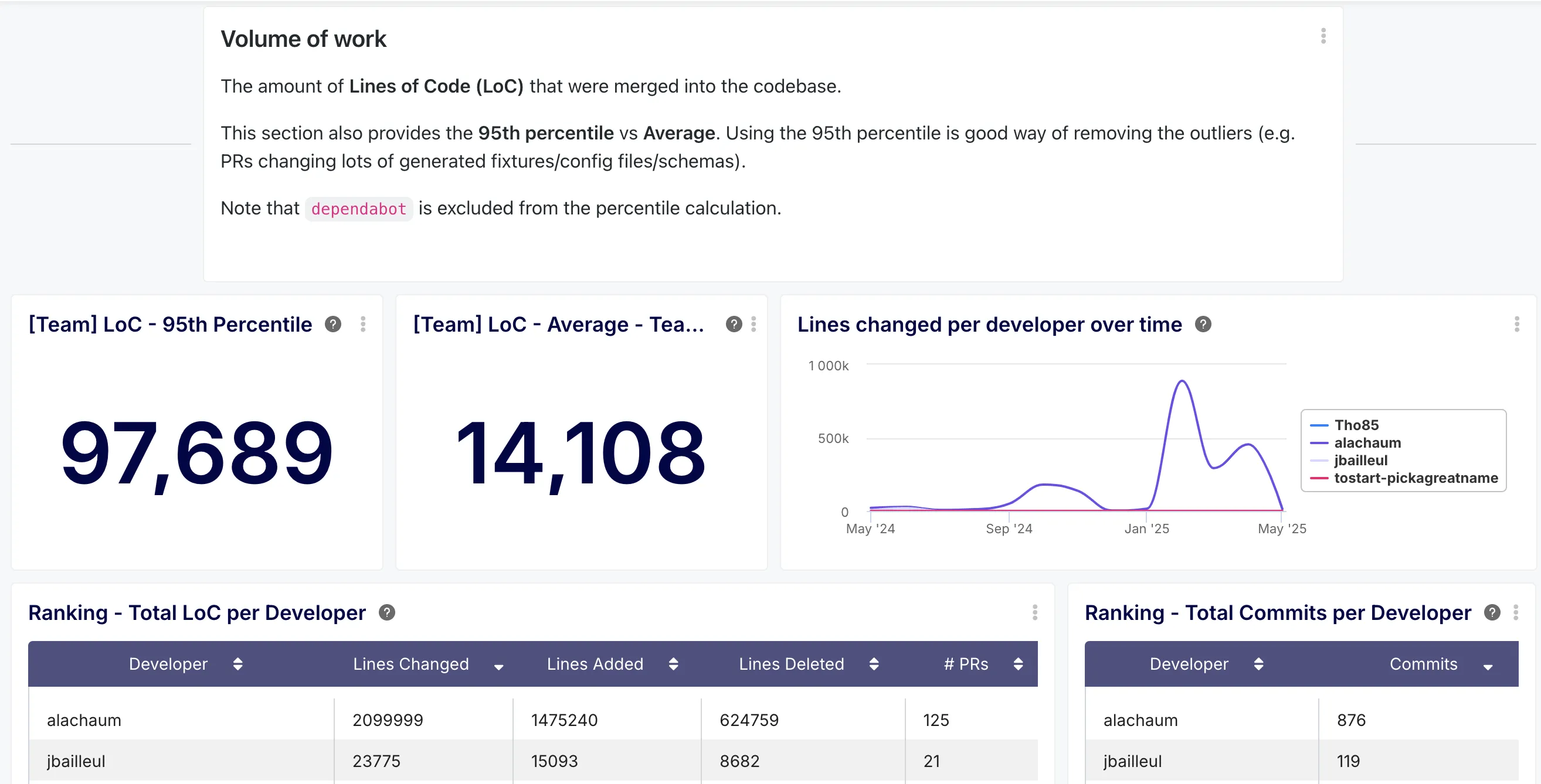 This section focuses on quantifying the output, primarily using Lines of Code (LoC) and commit counts, while providing context through team averages and percentiles. Remember, LoC should be viewed with caution and not as a direct measure of productivity or value, but rather as an indicator of change size and activity.