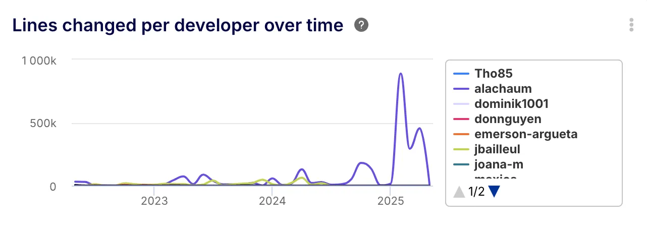 Description: A line chart showing the total LoC merged by each developer, typically month over month.