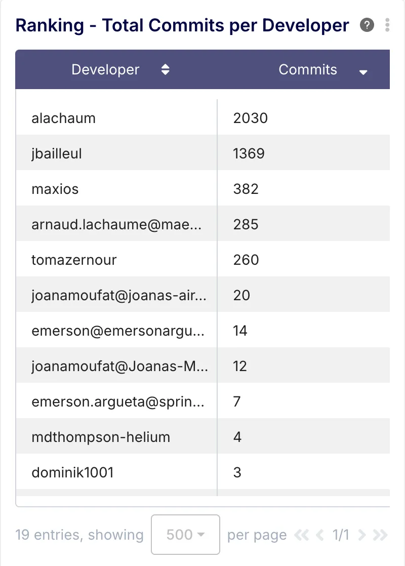 Benefit: Offers a snapshot of total code churn per developer. Useful for understanding workload distribution and activity levels. Again, interpret cautiously and in conjunction with other metrics.