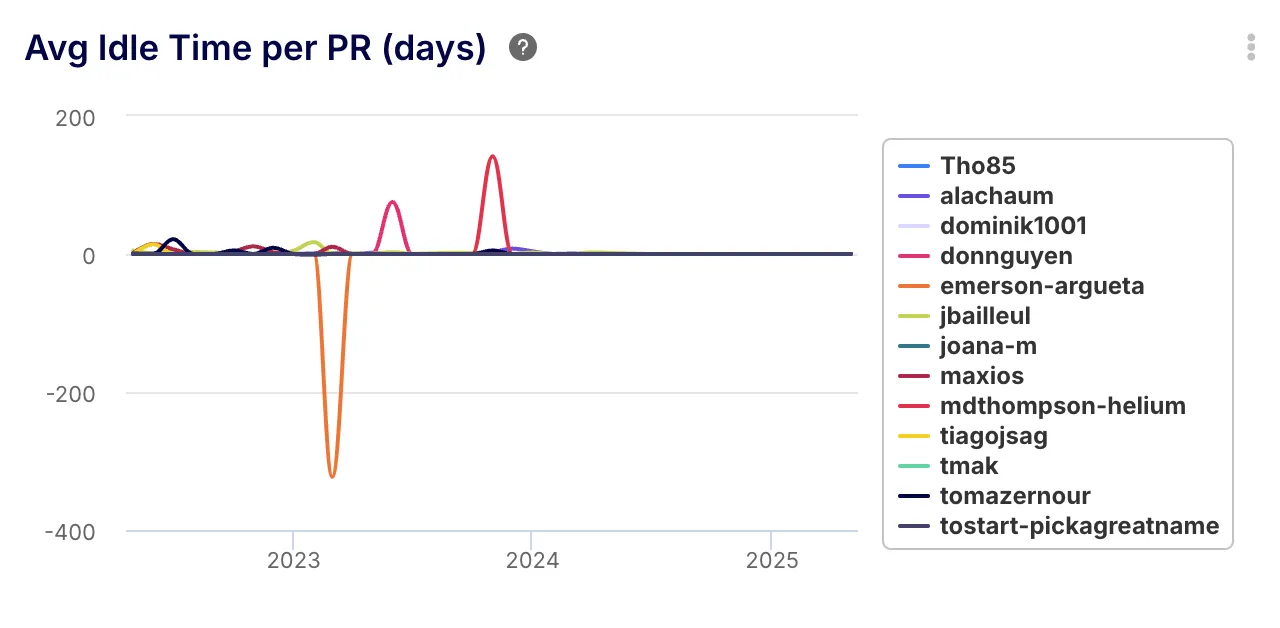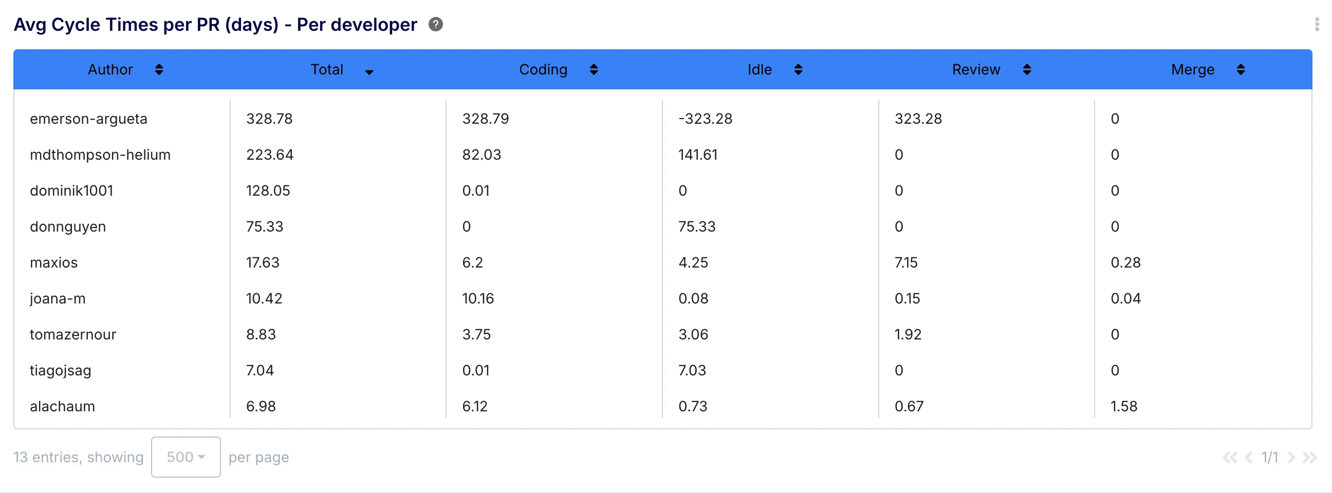 Benefit: Visualizes trends in overall PR efficiency for each developer compared to others. Helps spot improvements or regressions in individual or team throughput over the selected period.