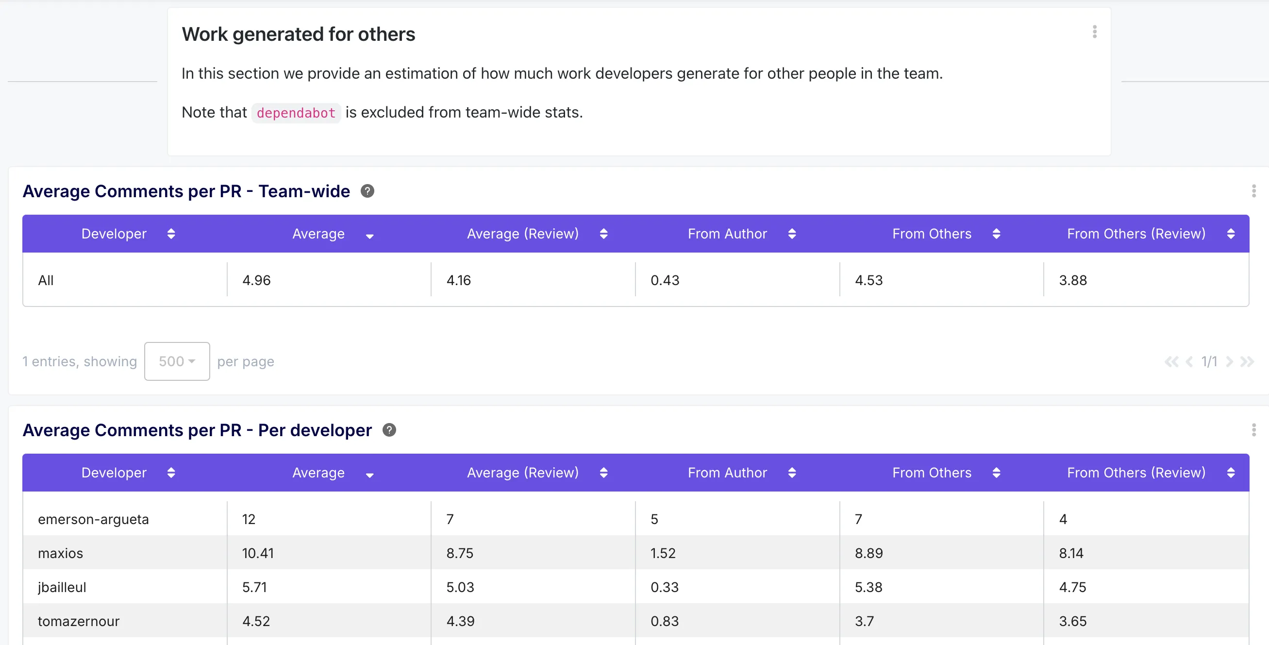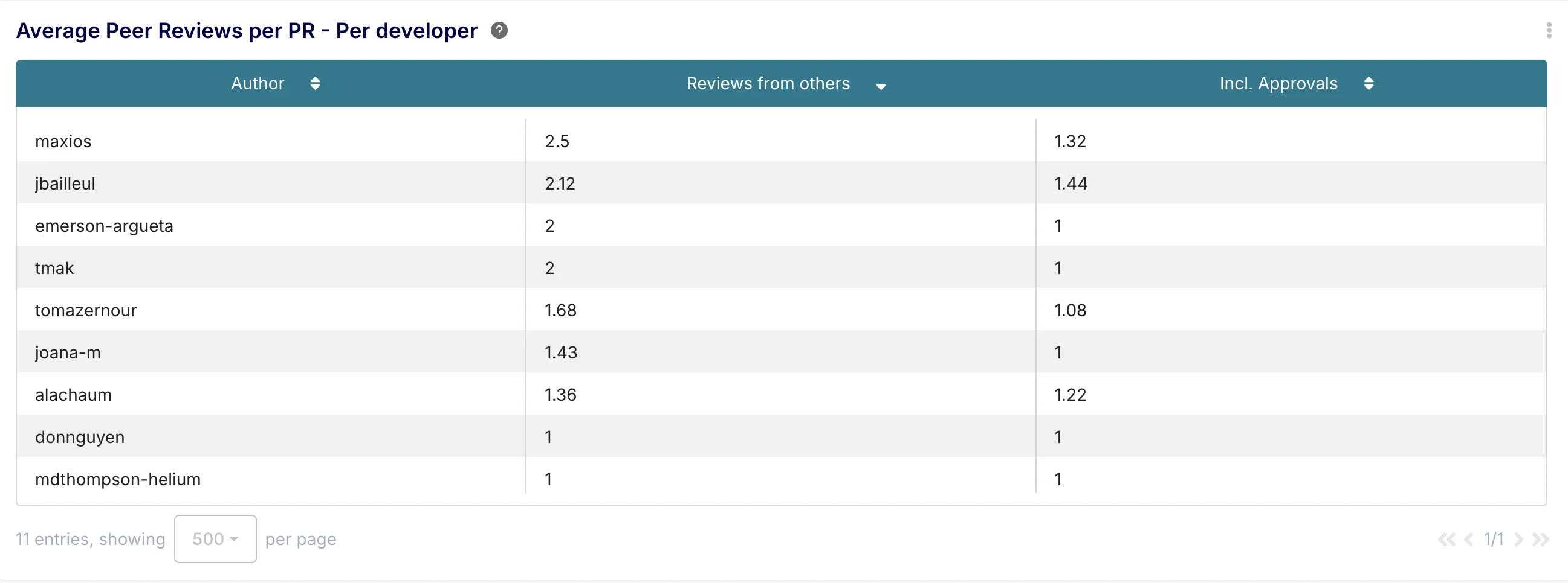 Description: Lists the average number of peer reviews received per PR for each developer, again potentially split into total and approving reviews.