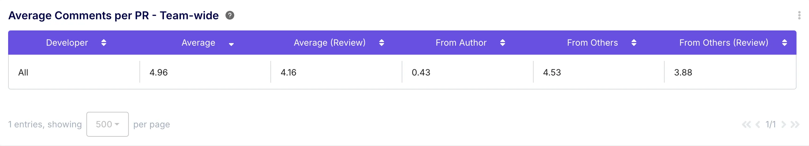 Description: Displays the team's average number of comments per PR, potentially broken down by comments from the author vs. others, and review comments vs. general comments (excluding bots).