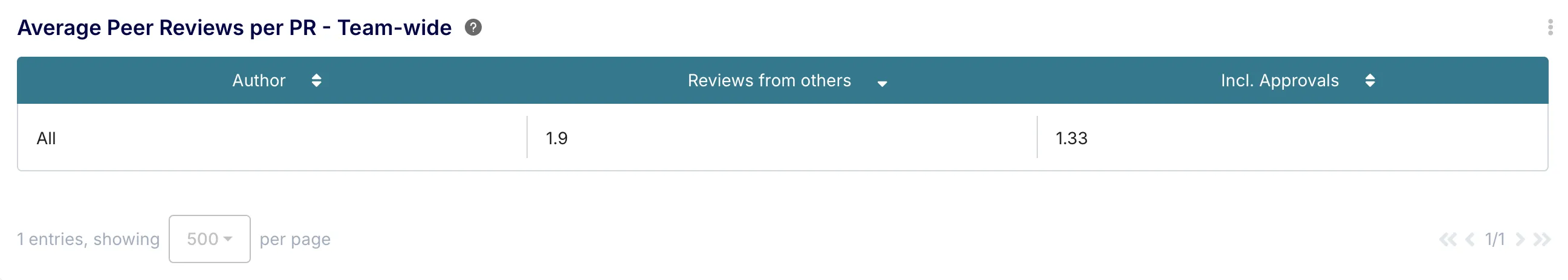 Description: Shows the team's average number of peer reviews per PR, often broken down into total reviews and approving reviews (excluding bots).