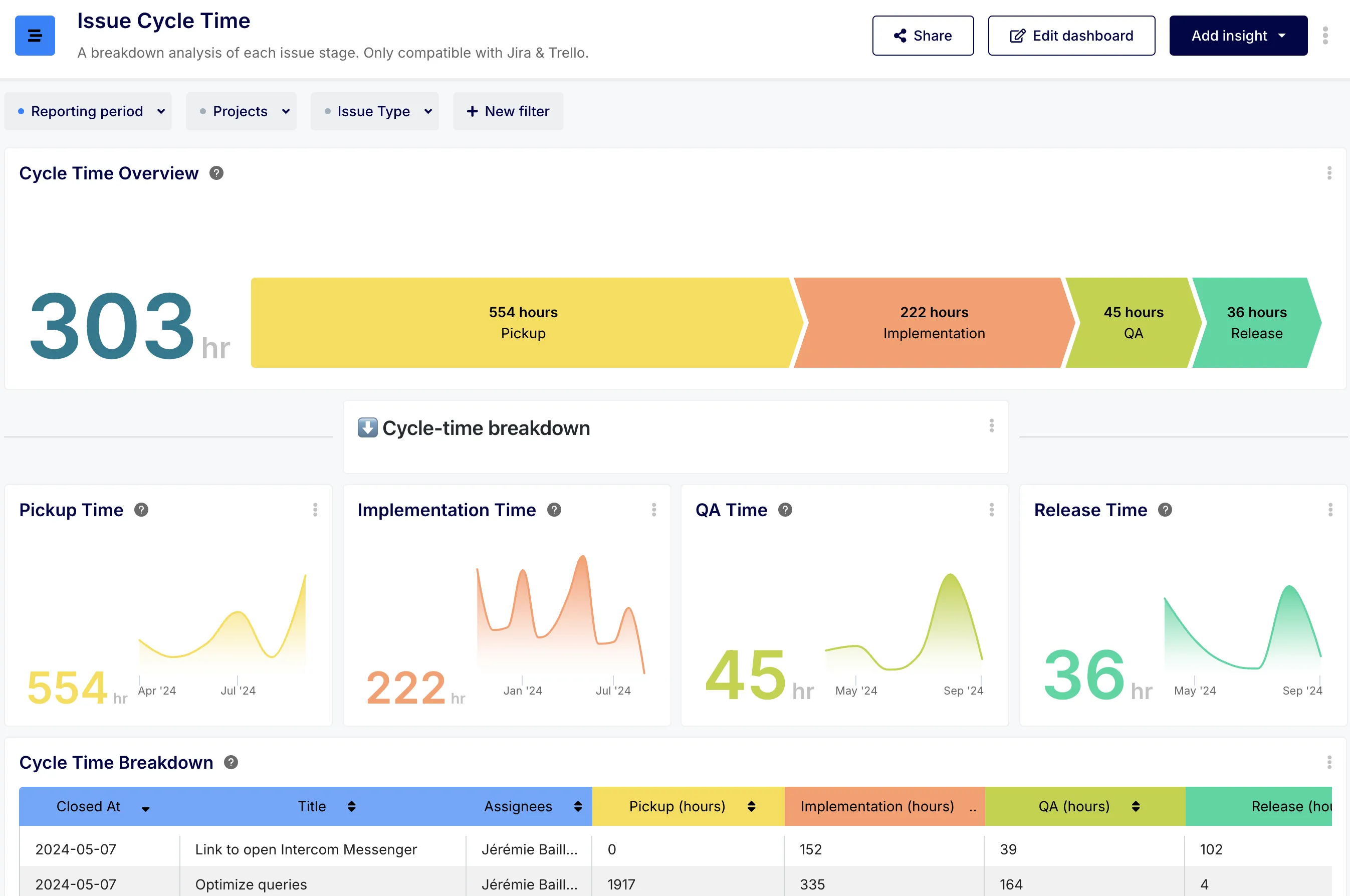 For software development teams, agile project management tools, such as Jira orTrello, can help streamline the development lifecycle and reduce cycle time.These solutions enable teams to plan, track, and collaborate on tasks more efficiently, while also providing visibility into the progress of individual projects and the overall development pipeline.These are productivity tools, that can lead to real Cycle Time benefits when coupled with automated analysis.