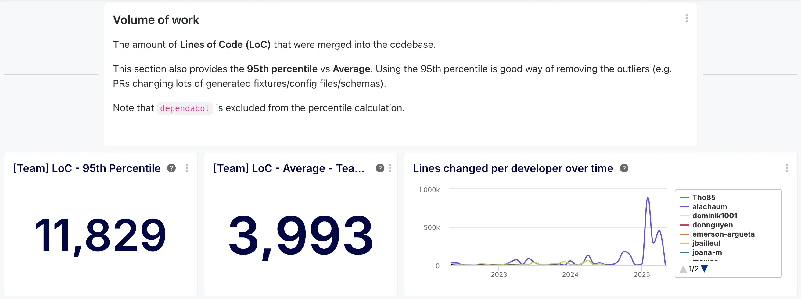 - What you get: Understand typical PR sizes (LoC) with team averages and 95th percentiles (to exclude outliers), plus individual LoC and commit trends.