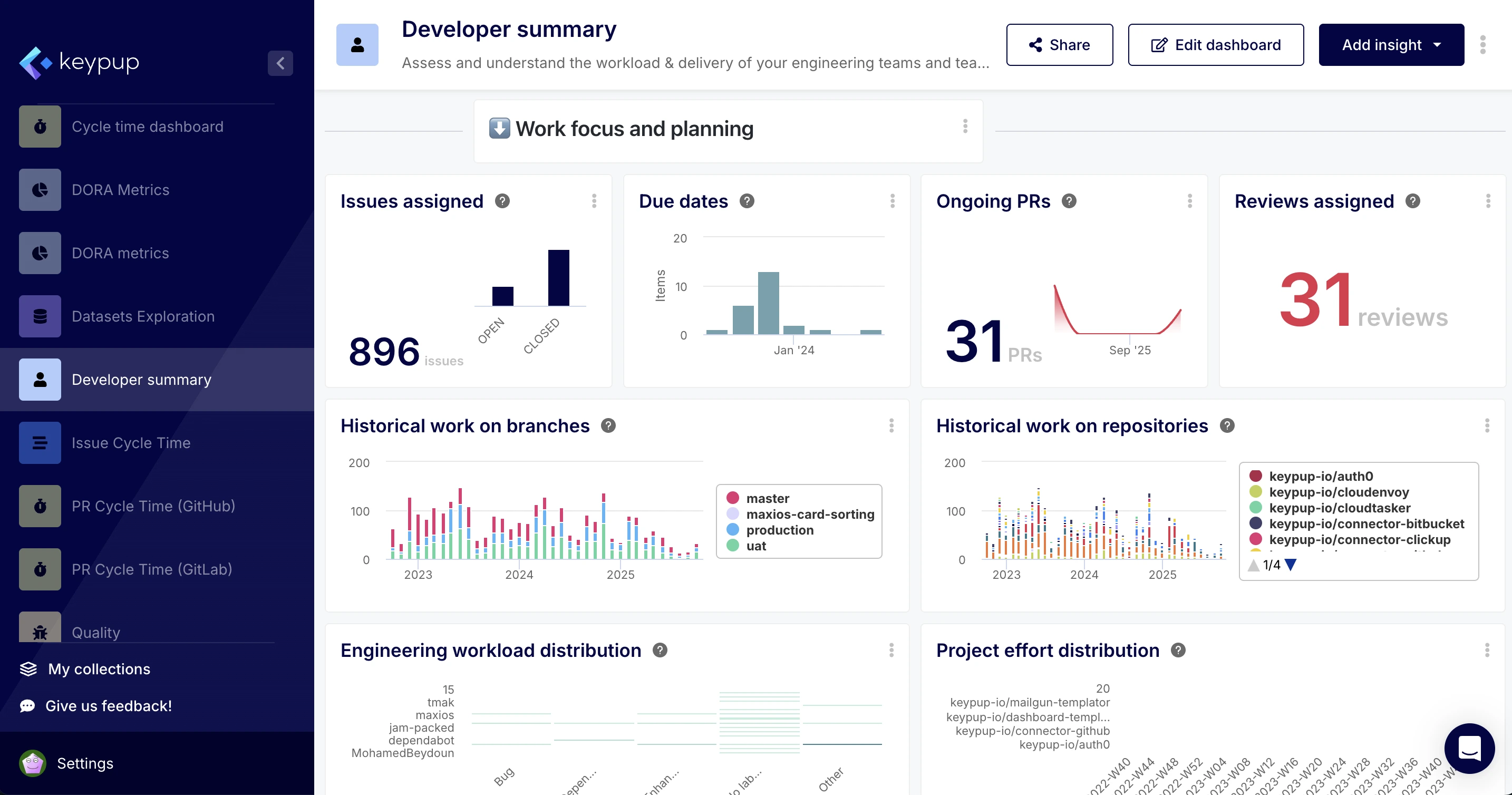 Your development data is scattered. Keypup brings it all together. Instantly connect your Git repos, Jira, and other tools to create a single, unified view of your entire development lifecycle.